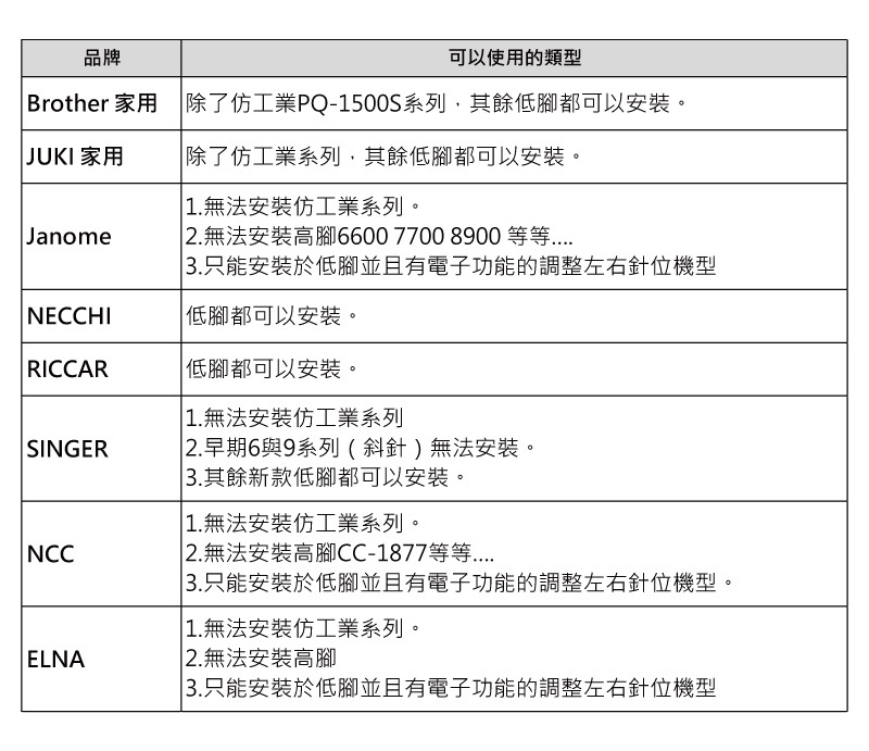 brother、JUKI、Singer、RICCAR、NICCHI:適用於新款式縫紉機。