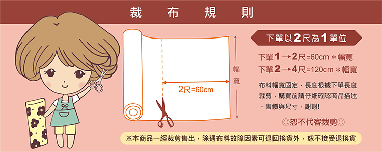 (I)因布料屬於「客製化給付」之商品,不適用7日鑑賞期限定,購買前請確認用布量,一經裁剪若無瑕疵故障,恕不退換。